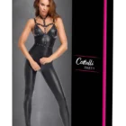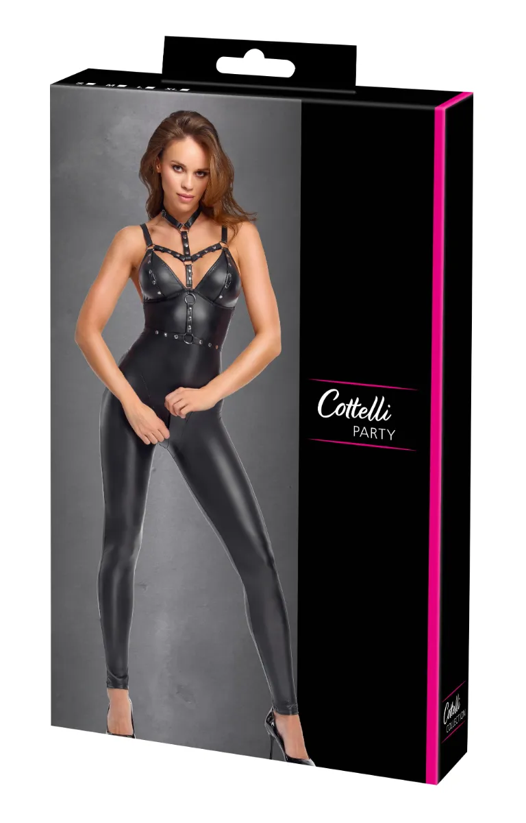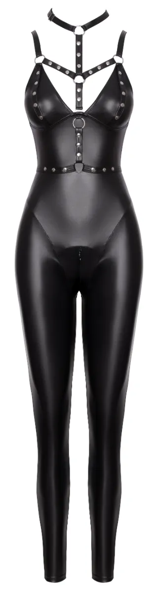 The skin-tight, sleeveless jumpsuit from Cottelli PARTY has long, tight-fitting legs. It is made out of trendy black matte look material with silver-coloured metal details. It fits like a second skin but it is also soft and stretchy for a very comfortable fit. The strap harness with decorative rings, studs and press studs accentuates the neck, cleavage area and waist, and can be adjusted in various places too. It can also be completely removed as well. The wireless cups can be opened because of the press studs. The straps can be adjusted at the back as desired. The 3-way zip is both practical and erotic. It can be zipped and unzipped in a variety of ways – from the lower back, over the crotch and right to the pubic area.
