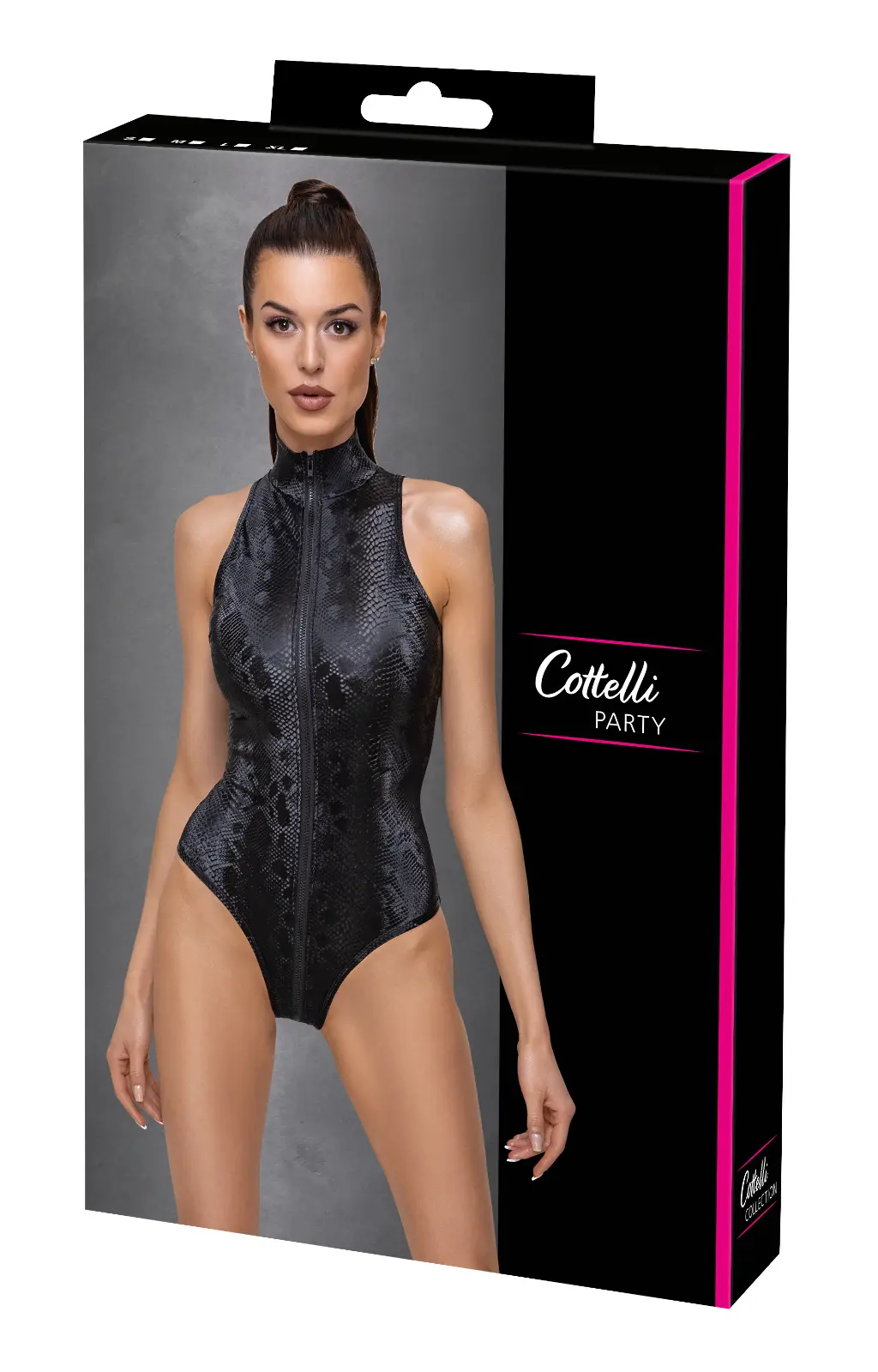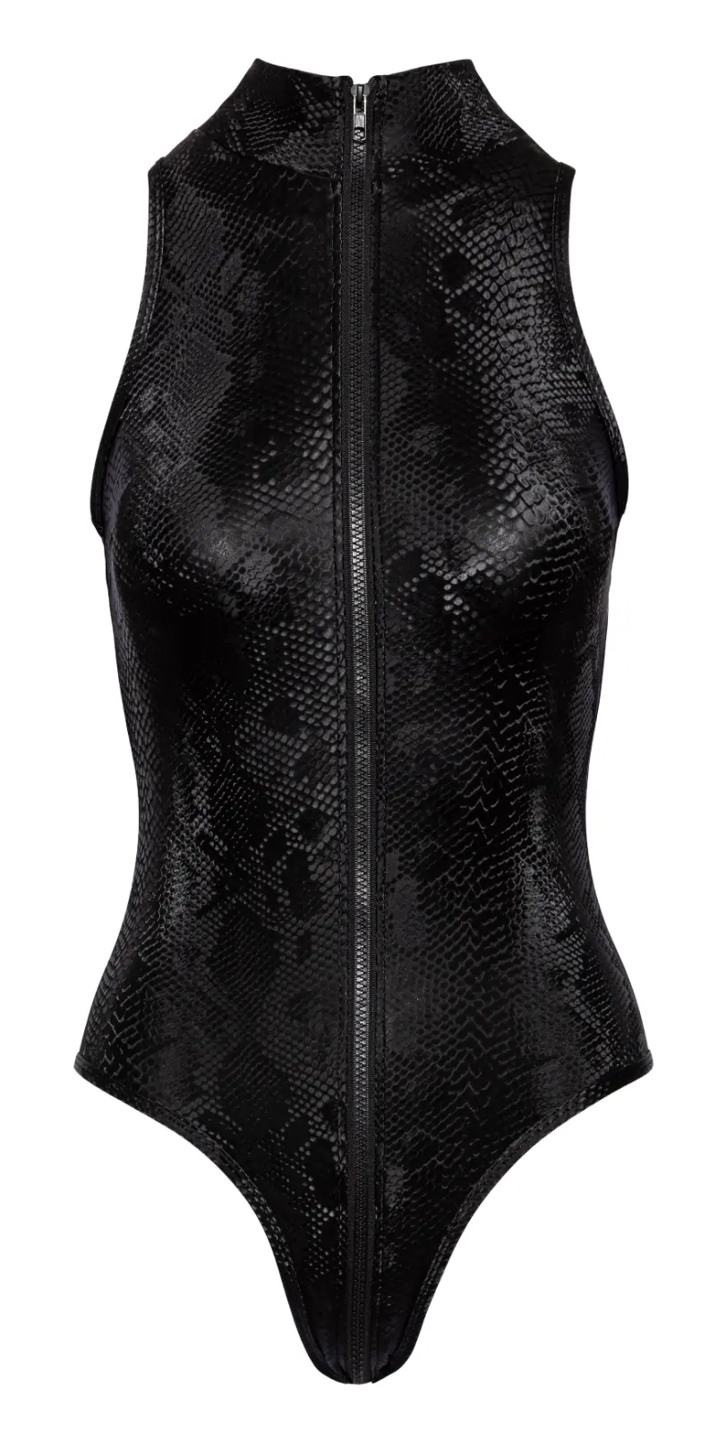 The trendy body from Cottelli PARTY is made out of shiny, shimmering matte material that has a snakeskin pattern on it. It is wonderfully stretchy for a skin-tight fit but it is also extremely comfortable to wear as well. With a practical (and erotic) 2-way zip that starts at the collar, goes over the crotch and stops at the buttocks.